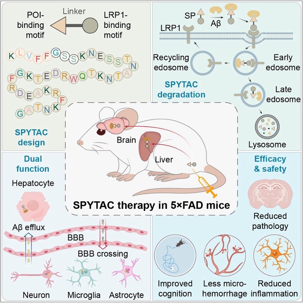 为解决这一难题,中国科学院动物研究所李伟研究员、胡宝洋研究员、周琪研究员团队另辟蹊径,开发了名为“可编程合成多肽介导的溶酶体靶向嵌合体(SPYTAC)”的新技术。该技术采用类似“分子胶水”的工作原理:一方面精准识别并结合致病蛋白,另一方面锁定细胞膜上的低密度脂蛋白受体相关蛋白1(LRP1)。这种受体不仅能高效地将有害物质送入细胞的“垃圾处理厂”——溶酶体进行降解,还能帮助药物穿越保护大脑的“血脑屏障”。
